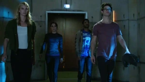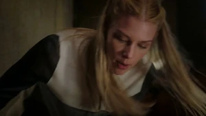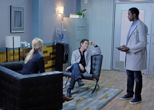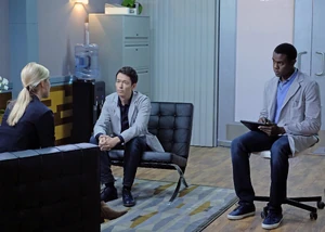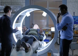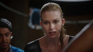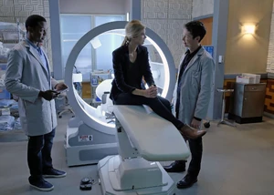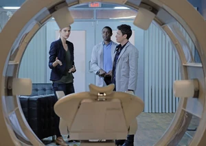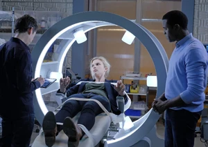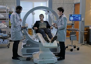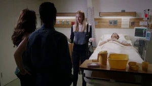 about Kirsten. She says she’s all over the place and they are down to two minutes. Camille moves her and she’s outside the restaurant. She sees Barbiero and says everything is blurry. Linus says his brain is pushing back and that’s why. She gets pulled to a memory of Cameron as a kid at the hospital.She’s in Cameron's Memories. The nurse says it’s against the rules to walk around and he thanks her when she say she can anyway. Then we see him outside her mom’s room and she’s there with her dad. He asks her what she’s doing and she’s painting her mother’s nails. She tells him they were in a car crash and asks why he’s there. He says he had heart surgery. They talk as her dad sleeps. Kirsten looks at her parents then the young her starts crying and Cameron says she’ll be fine then says her dad is really smart. He says to trust him. Camille says to bounce and she does. They all run to revive Cameron. Ayo starts the process. Kirsten begs him to wake up. He flatlines.