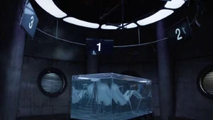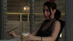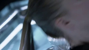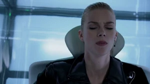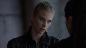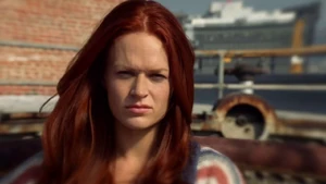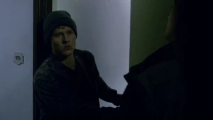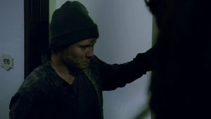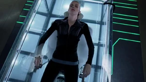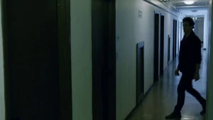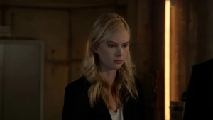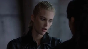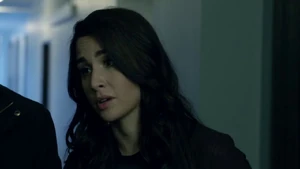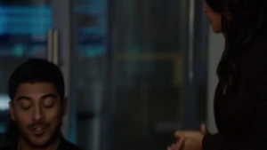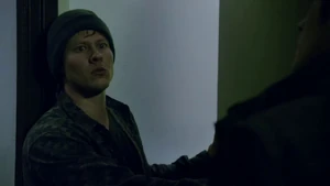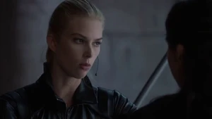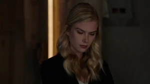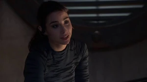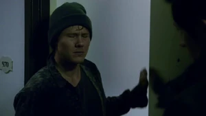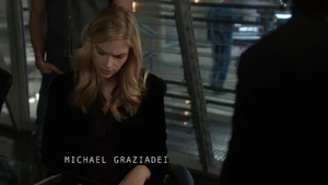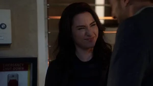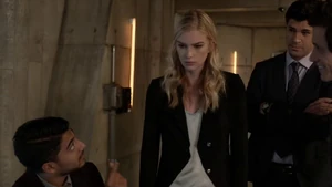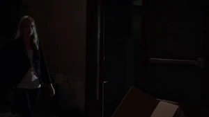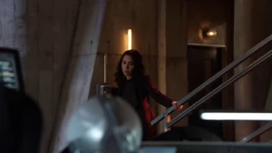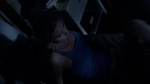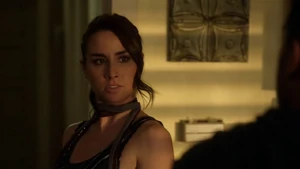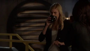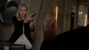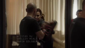 She then grabs Fisher’s gun and scares the three guys. Kirsten goes to the keyboard, presses a few buttons and then back out still holding the gun. She jammed the system and locked them out of the elevator. They think she got Sandy’s brainwashing when she stitched in and was just activated.