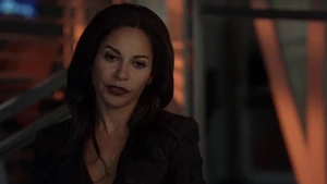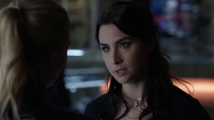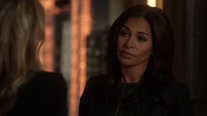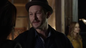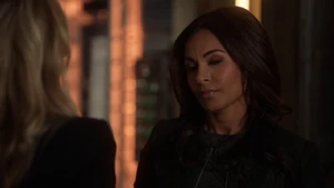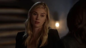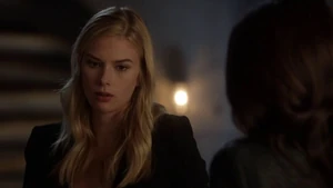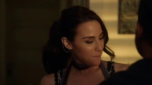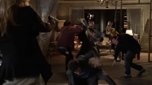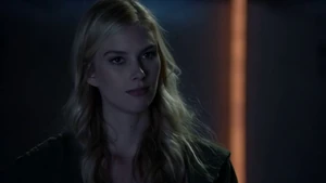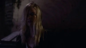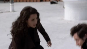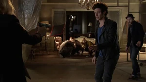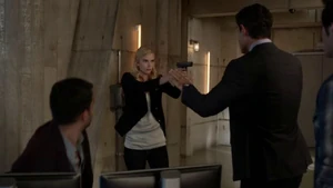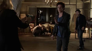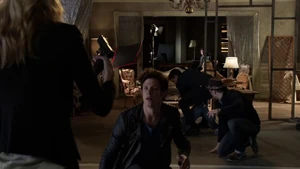 He asks if she remembers when he died for her and says he’s willing to do it again, but this time she can’t bring him back. He says make the bounce. She comes back to herself and says she’s okay. Bain sighs. Then another actress takes aim at Bain and she shoots the woman.