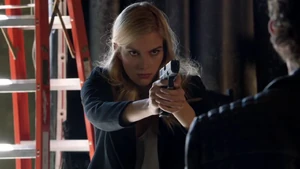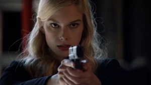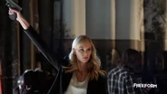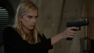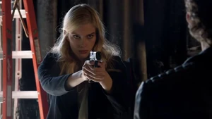 Cameron lurks around looking for Kirsten and spots her heading for Bain. Kirsten fires a warning shot then takes aim at Cameron when he interferes. He says please don’t pull that trigger. Fisher has his gun out and Cameron tries to talk her down.